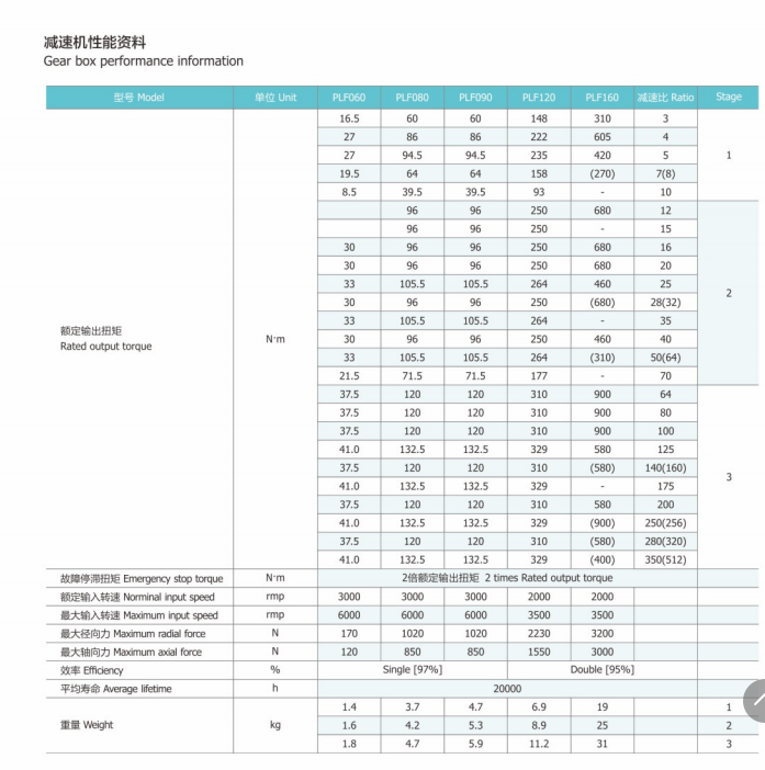 PLF120行星減速機性能資料